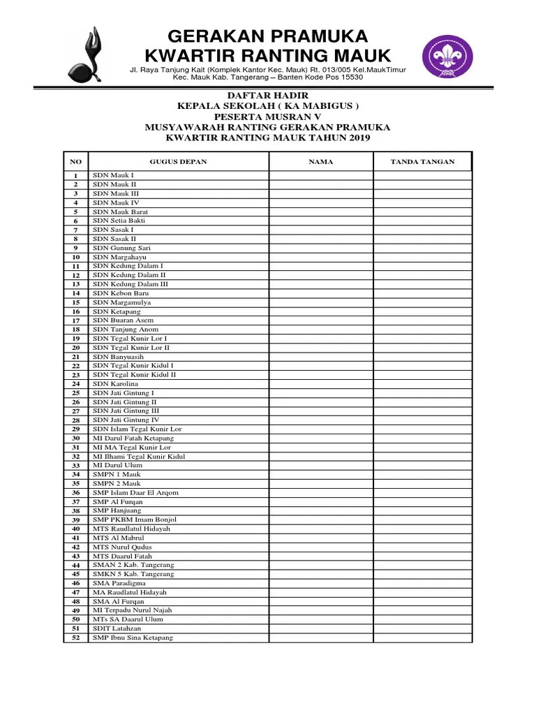 Contoh Daftar Peserta Lomba Pramuka - Share Contoh Proposal Lomba Pramuka - Petunjuk pelaksanaan & teknis lomba prestasi pramuka penggalang ( losipraga ) tahun.. B) mengisi dan menyerahkan formulir pendaftaran lomba, biodata peserta dan . Dan tiap gugus depan dapat mengirimkan lebih dari 1 kontingen putra dan putri. Lomba terbuka bagi pramuka siaga, pramuka penggalang, pramuka penegak, dan pramuka pandega di . Pengumuman 6 besar, sedangkan titik kumpul di setiap korwil akan diumumkan. Daftar pelaksanaan lomba tingkat nasional (lt v):.